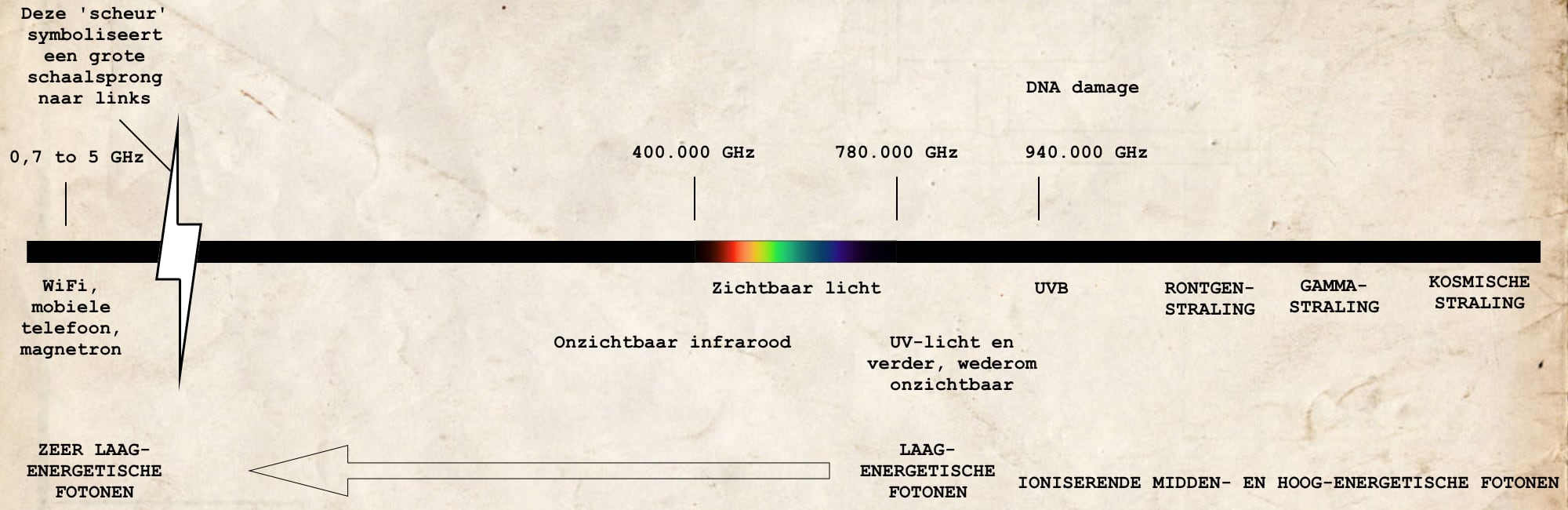 De waarde van de constante van Planck is $ h = 6,626070 \times 10^{-34} $ Js (Jouleseconde). De waarde van de uittreearbeid van het koolstofatoom, waar ons lichaam van gemaakt is, bedraagt $ \phi = 1,8041 \times 10^{-18} $ J. Als een wifi-foton een frequentie heeft van 2,5 GHz, kun je zelf berekenen of wifi elektronen uit een koolstofatoom slaat. Je moet dan 2,5 GHz even converteren naar $2,5 \times 10^9 $ / s (per seconde). Dankzij Albert kan een kind tegenwoordig de was doen. Je kunt het op de achterkant van een envelop uitrekenen. Als alle termen aan de rechterkant van het is-gelijk-teken een waarde opleveren die groter is dan nul, verkoop dan onmiddellijk je router en, gezien de diagram hierboven, laat sowieso het licht uit op het toilet als je dan echt moet. Succes met uitrekenen! (Of check de uitwerking.)